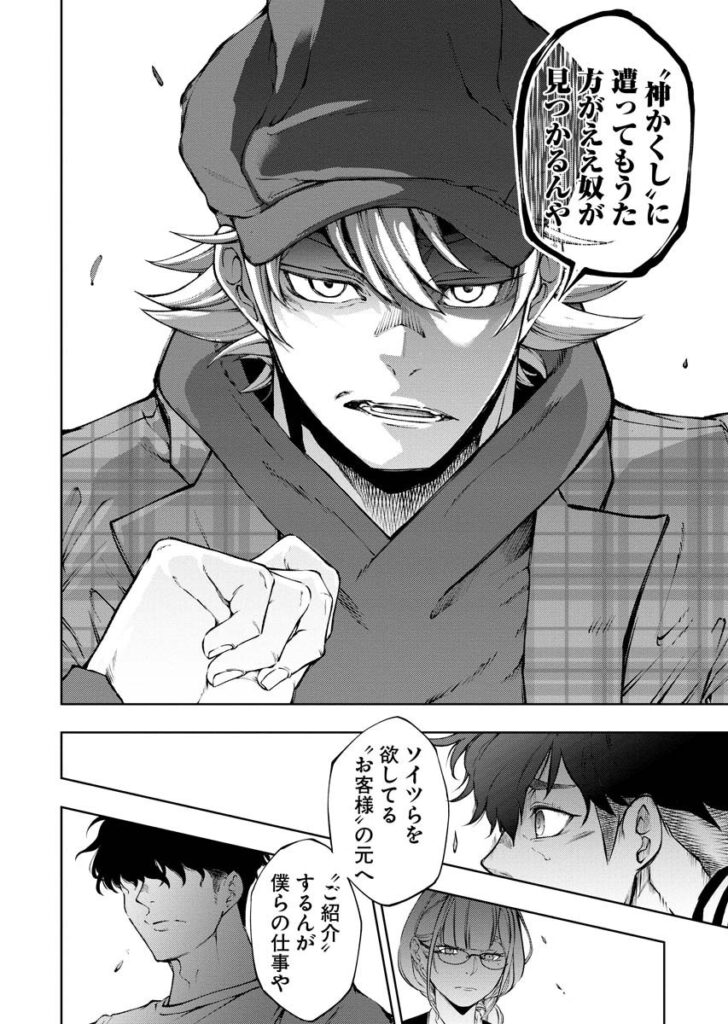 依頼内容は、“ある人物を不慮の事故に見せかけて消してほしい”というもの。一見すると単なる犯罪請負のようですが、神かくしが提供するのは単なる殺害ではありません。彼らの仕事は、人間を“神”や“怪異”へと紹介することです。