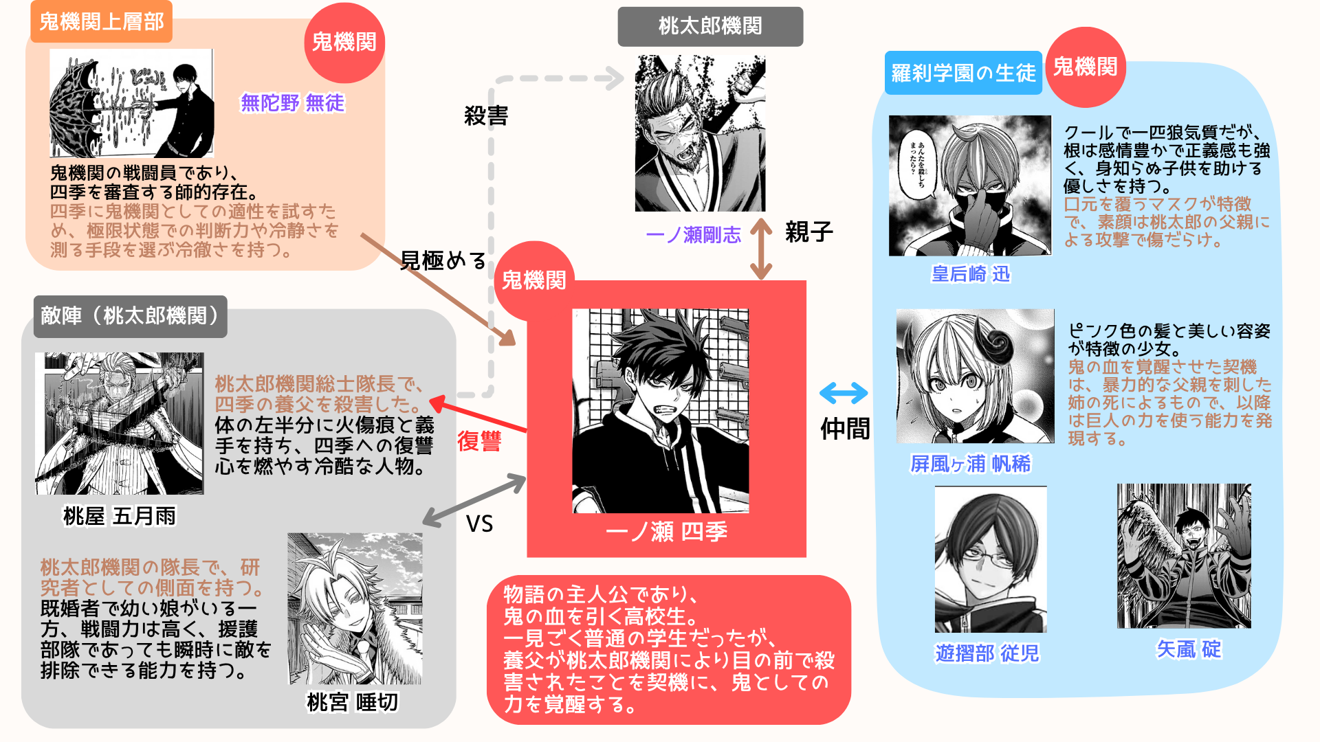 『桃源暗鬼』の相関図では、鬼機関と桃太郎機関の二大勢力が複雑に絡み合う。主人公・四季を中心に、無陀野や迅、帆稀といった仲間が鬼機関の主要戦力として存在し、敵である桃屋や唾切などの桃太郎機関幹部が彼らに立ちはだかる。