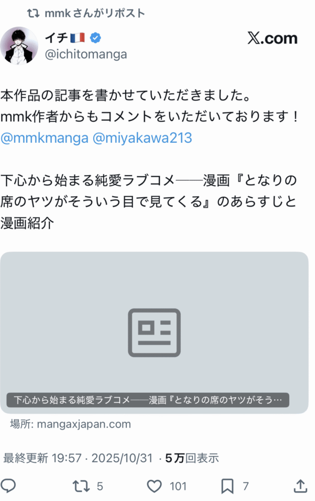 漫画『となりの席のヤツがそういう目で見てくる』作者mmkさんのX